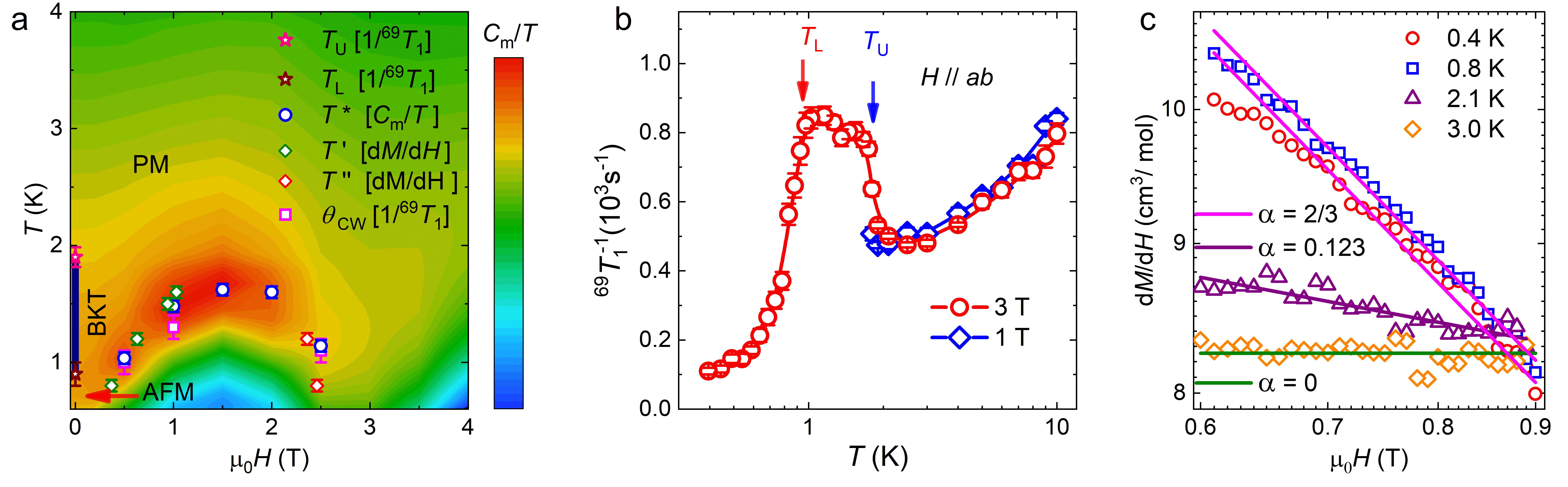 图 a. TmMgGaO4 施加面外磁场的相图;b. 面内磁场下的自旋晶格弛豫率;c. 不同温度下微分磁化率的幂律拟合。