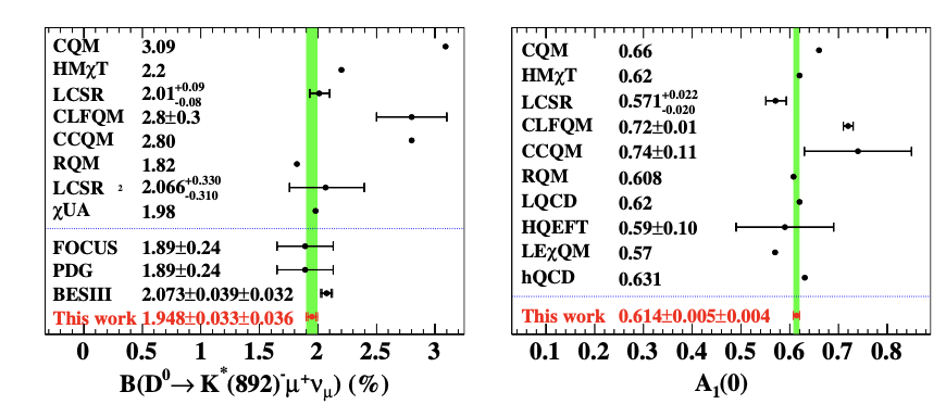 图二:(左图)D0→K*(892)-μ+νμ衰变分支比和(右图)A1(0)的实验测量值与多种非微扰理论计算值的对比图。