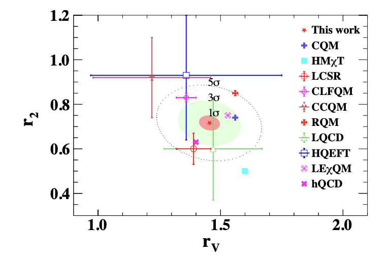 图三:D0→K*(892)-l+νl衰变形状因子参数的实验测量值与多种非微扰理论计算值的对比图。