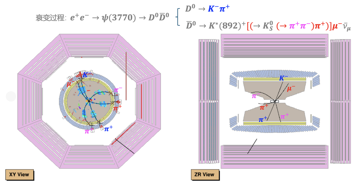 图一:从正负电子对撞数据中筛选出的D0→K*(892)-μ+νμ衰变事例显示图。其中,图上蓝色、红色和粉色标记的粒子为北京谱仪III探测器探测到的末态粒子。